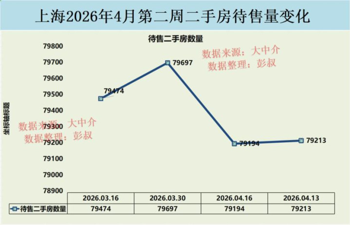 不过上海楼市的房价双涨,成交量又那么高,大中介上上海楼市的待售二手房数量变化到不大。从3月16日到4月13日,上海楼市的待售二手房数量从79414套变成了79213套,整体的变化不是很明显。