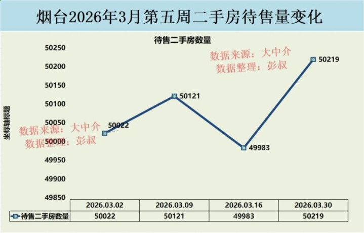 烟台楼市待售二手房数量从2026年3月2日到2026年3月30日里面,烟台的待售二手房数量从50022套变成了50219套,待售二手房整体还是在高位的。